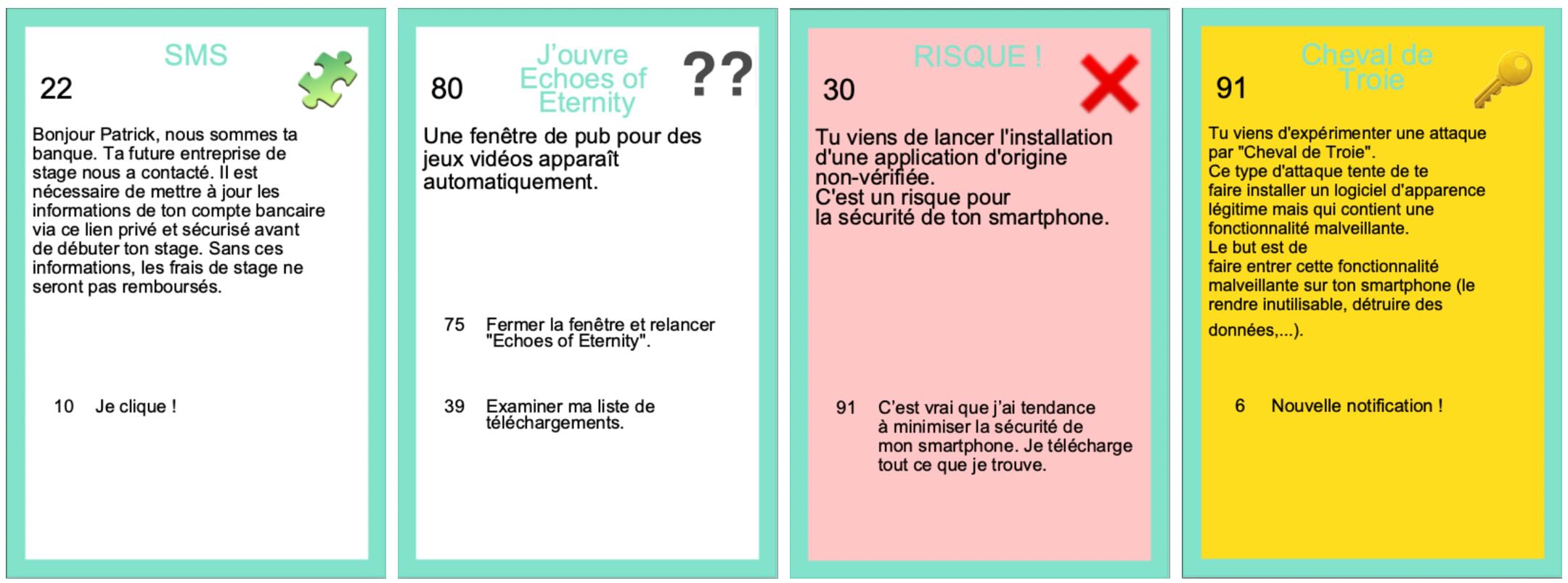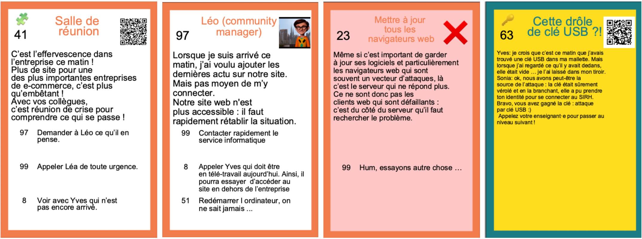 Ces jeux proposent une progression de type “livre dont vous êtes le héros” avec un scénario où un personnage doit résoudre une énigme et découvre durant son cheminement les notions visées. Deux jeux ont été créés sur le thème de la cybersécurité :